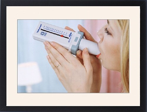 - Image Description: MODEL RELEASED. Lung function test. Womanbreathing into a peak flow meter (spirometer). Apeak flow meter is used to monitor lung functionby measuring the maximum rate at which air isexpelled from the lungs. The patient takes a deepbreath and breathes out as hard as possible intothe mouthpiece. This test can be used to detectasthma and other lung disorders.